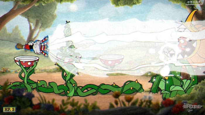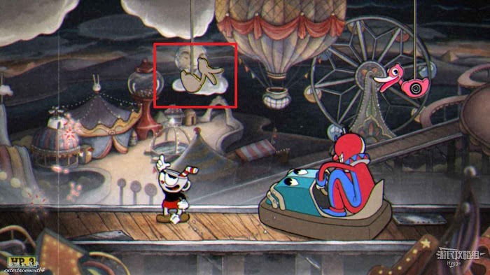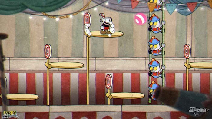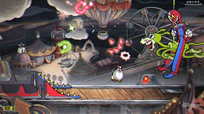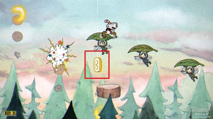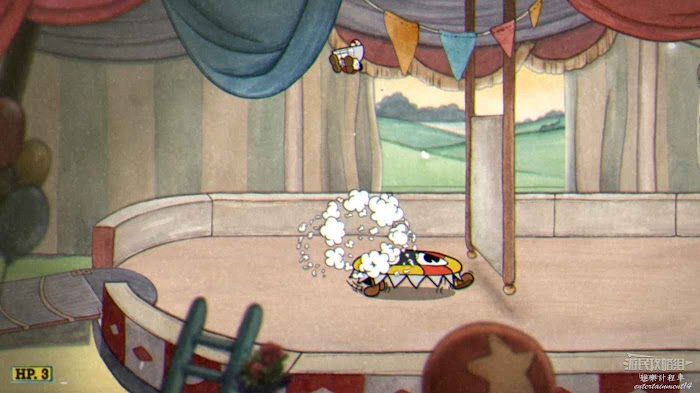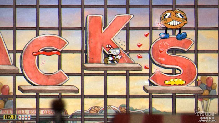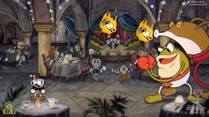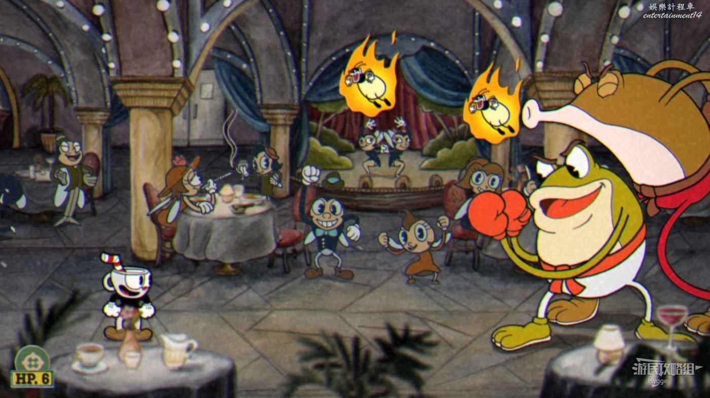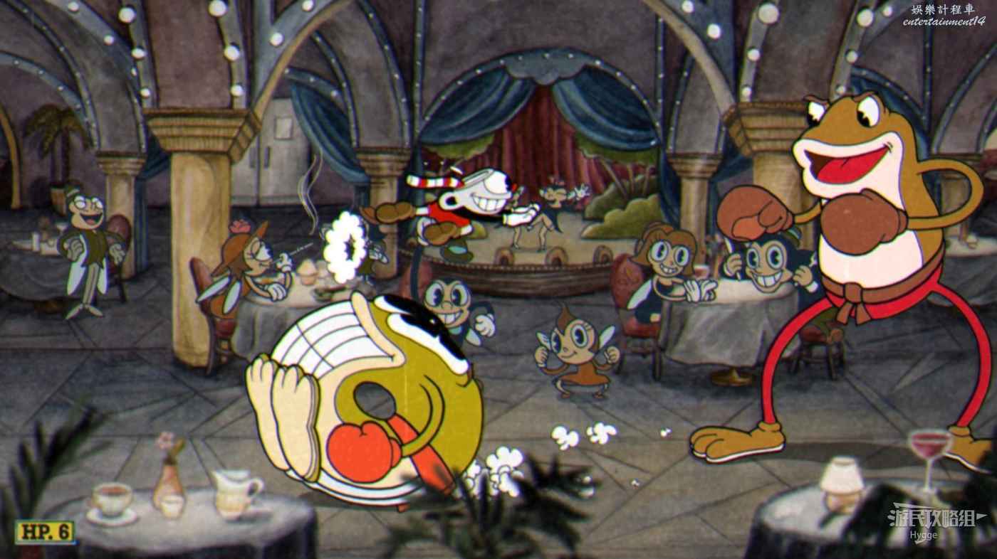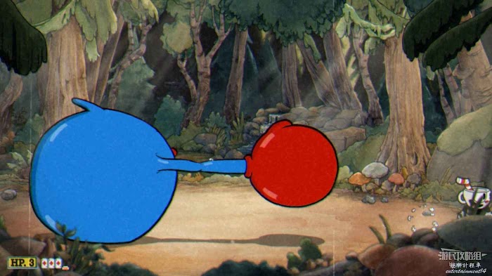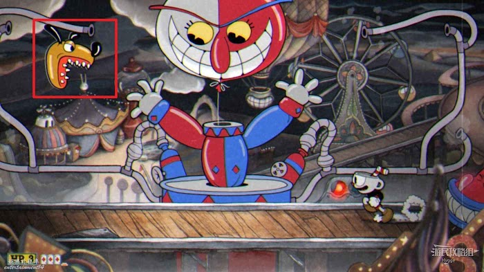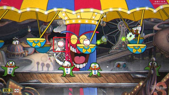 隨後利比會變成電風扇將我們吹向呱呱,呱呱則會不斷扔出彈跳的圓球攻擊。向上和向下扔出的球彈跳的軌跡會略有不同,注意躲避的同時攻擊利比和呱呱叫即可。