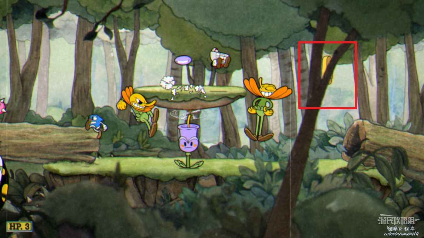 在經過一個啄木鳥後可以找到第1枚金幣,可以使用空中格擋拍擊粉色的瓢蟲或者從右側較高的地方跳躍衝刺獲得。