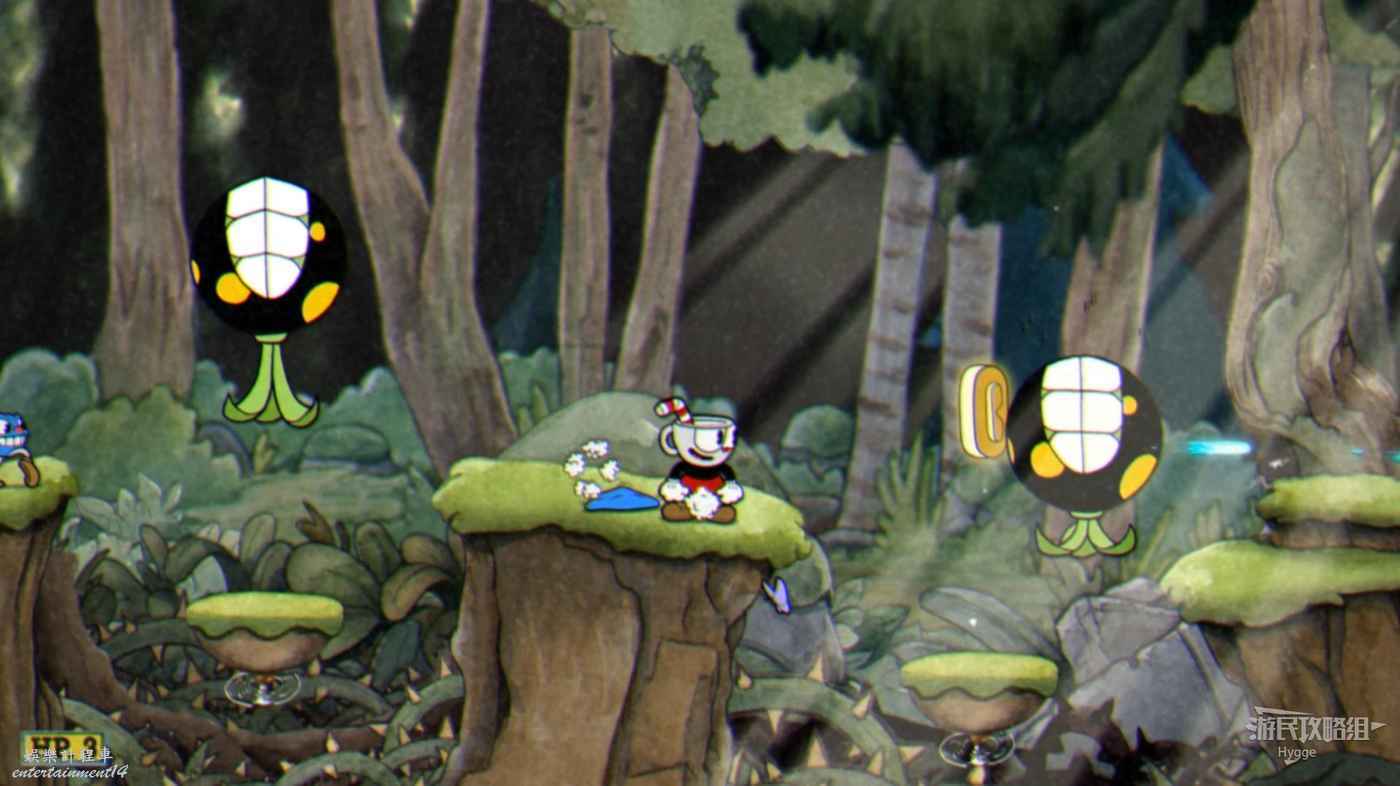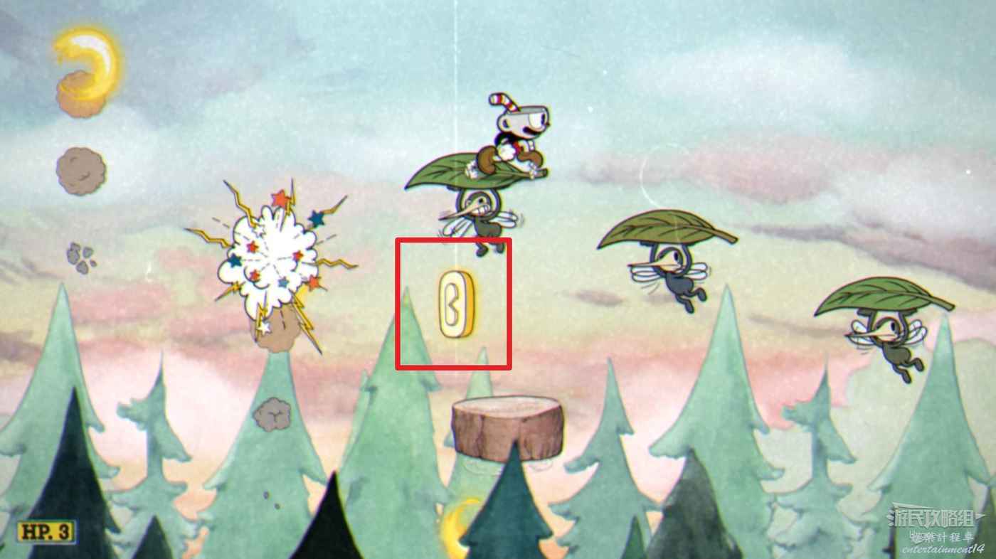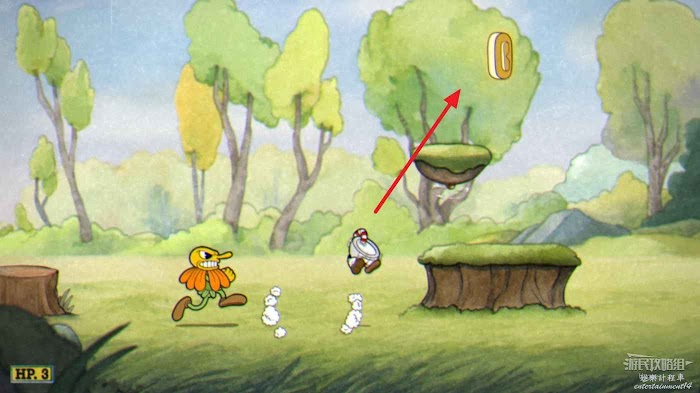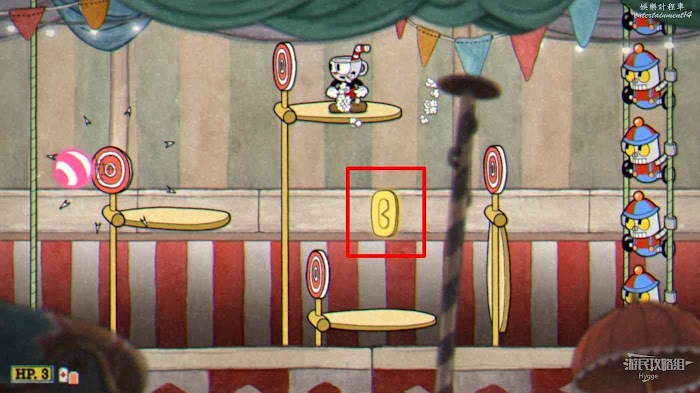第3枚金幣位於獨木橋上方,可以通過格擋拍擊上下移動的粉刺球獲得該金幣。
