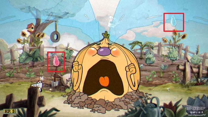 洋蔥在被攻擊時會不停大哭,隨後在眼淚中會不斷落下水滴。粉色的水滴可以通過格擋拍擊進行抵消。