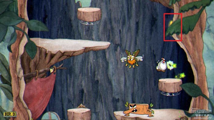 第4枚金幣位於剛剛離開樹幹時,通過舉樹葉的小人和升降平台即可獲得該金幣。
