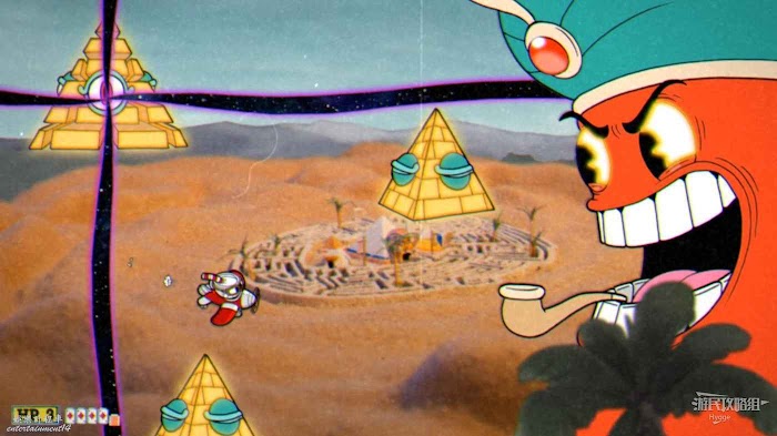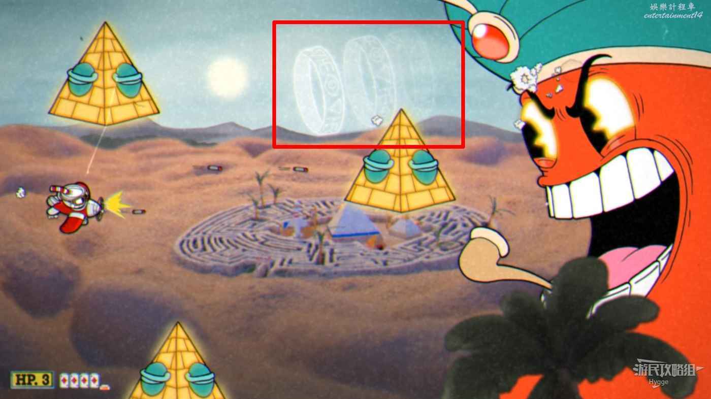 同時場地中還有三個不斷旋轉的長有眼睛的金字塔,每隔一段時間其中一個金字塔就會睜眼並十字發射光波攻擊。