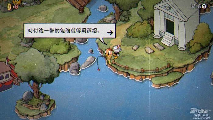 穿過擊敗利比和呱呱後新出現的橋,來到河對岸後向下走來到陵墓1前,與正在釣魚的金魚交談得知對付鬼魂需要使用格擋拍擊。