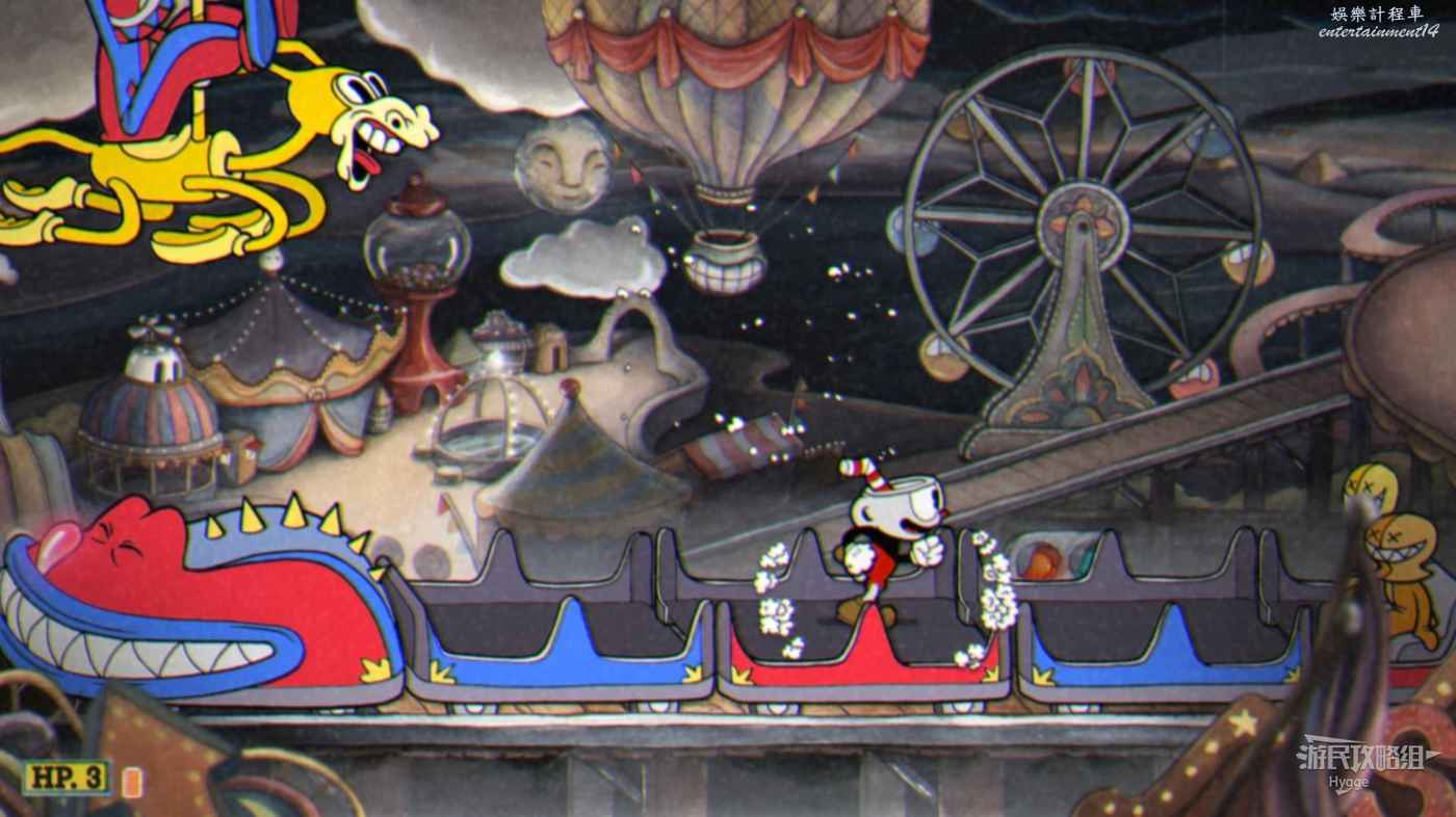 二階段中會有過山車從軌道上從右向左行駛,跳過過山車的車頭和可以在過山車的車廂中活動,注意躲避有人乘坐的車廂即可。