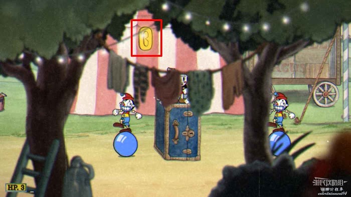 離開帳篷後在遇到的第一個踩紅球的小丑處可以找到第4枚金幣。