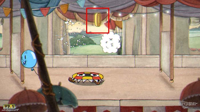 第2枚金幣位於剛剛離開帳篷後碰見的第一個踩著藍色球的小丑上方。