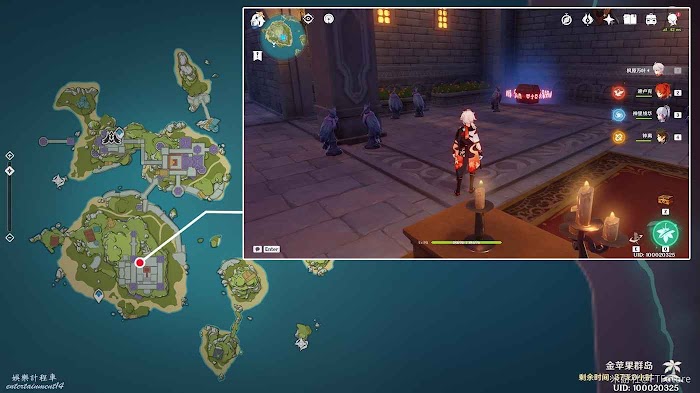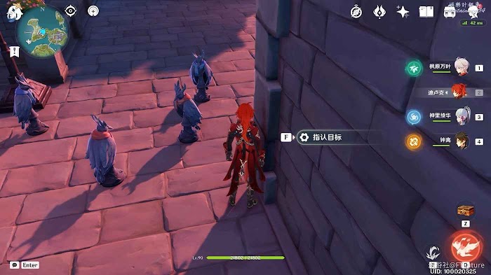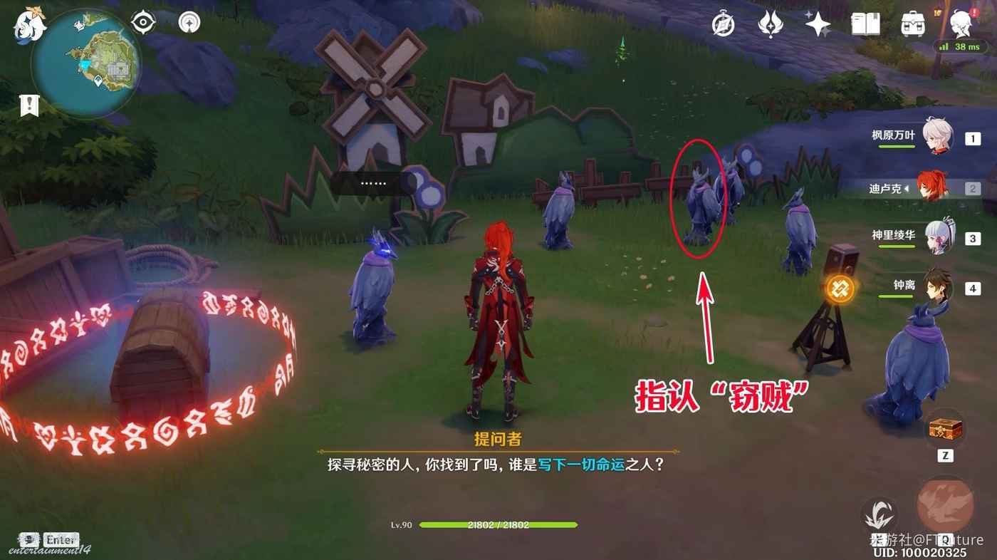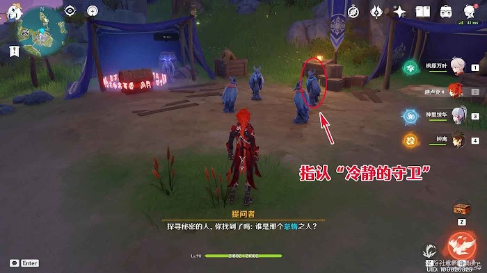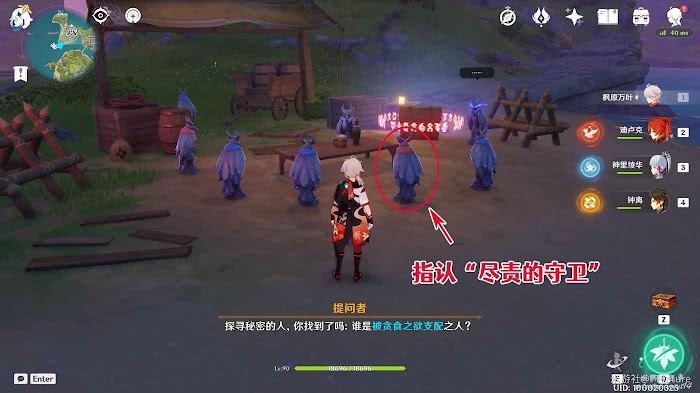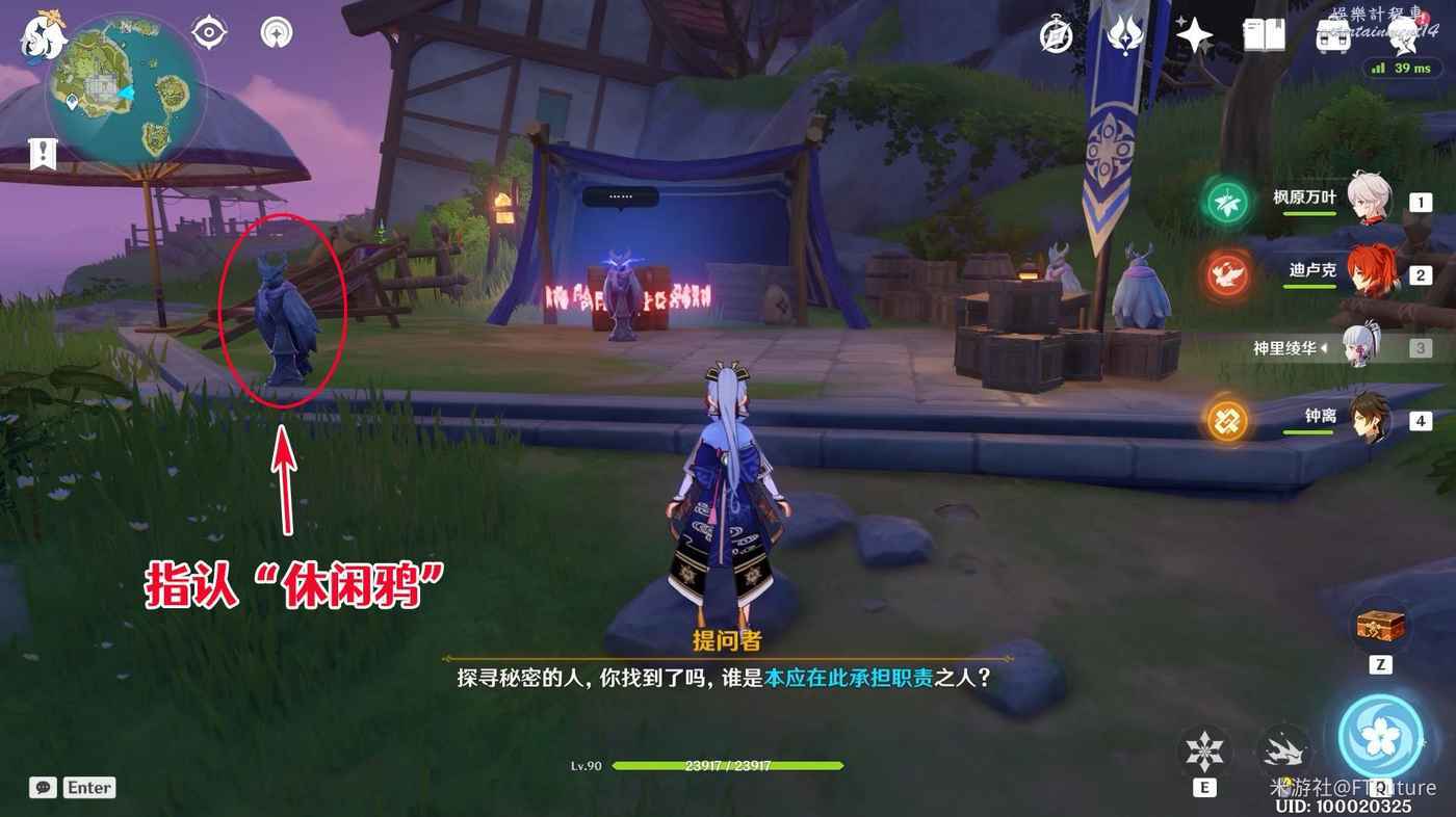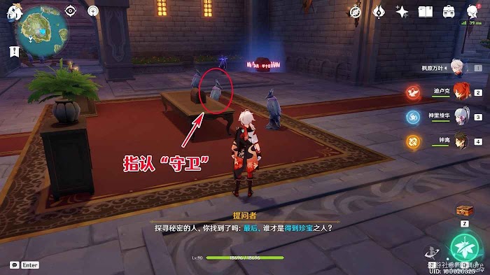 注意,這裡由於雕像們站的很近,直接過去選無法分辨出哪個選項對應哪個角色,很容易選錯,建議來我下圖的位置,貼著牆一點點挪到只能選到“盜寶團「呱」”的位置再進行指認。