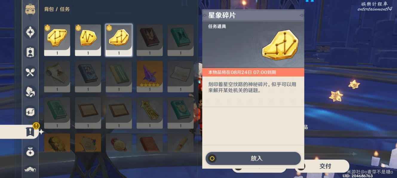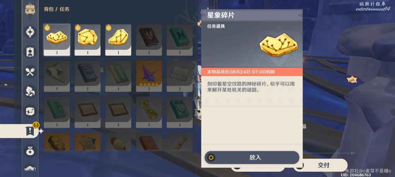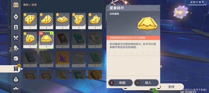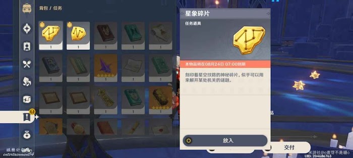 然後跟著星星就出來了,這裡是要尋找的碎片點位,旁邊還有一個寶箱可以拿一下,拿完寶箱會到水占盤再次進入