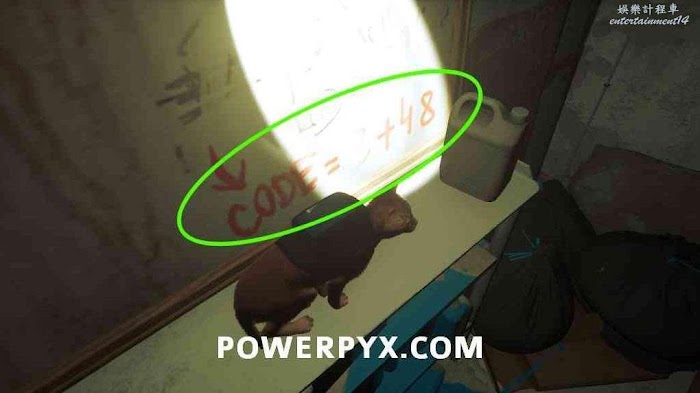 進入大門旁邊的儲藏室,爬上架子,打開手電筒照向白板,即可看到紅色字體“CODE=3748”,這就是開門密碼。
