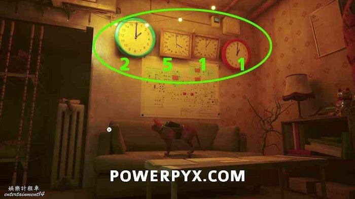 牆上掛著4個鐘錶,時針所指的位置就是密碼,連起來即可得到開門密碼2511。