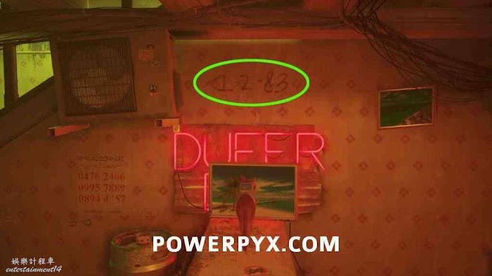保險箱的密碼位於城鎮中央的酒吧“DUFFER BAR”內。跳到吧台上,可以看到“DUFFER BAR”的霓虹燈標誌牌上掛著一幅畫,互動後畫會掉下來,露出後邊的密碼1283。