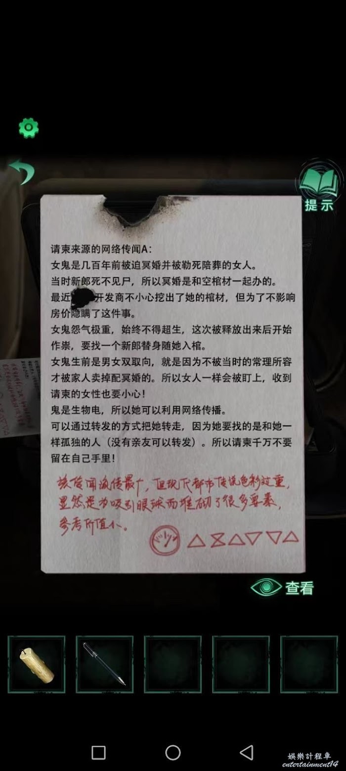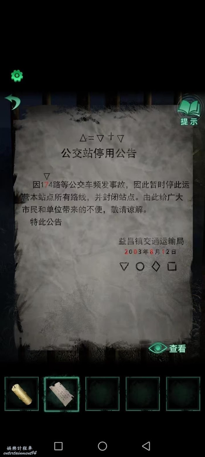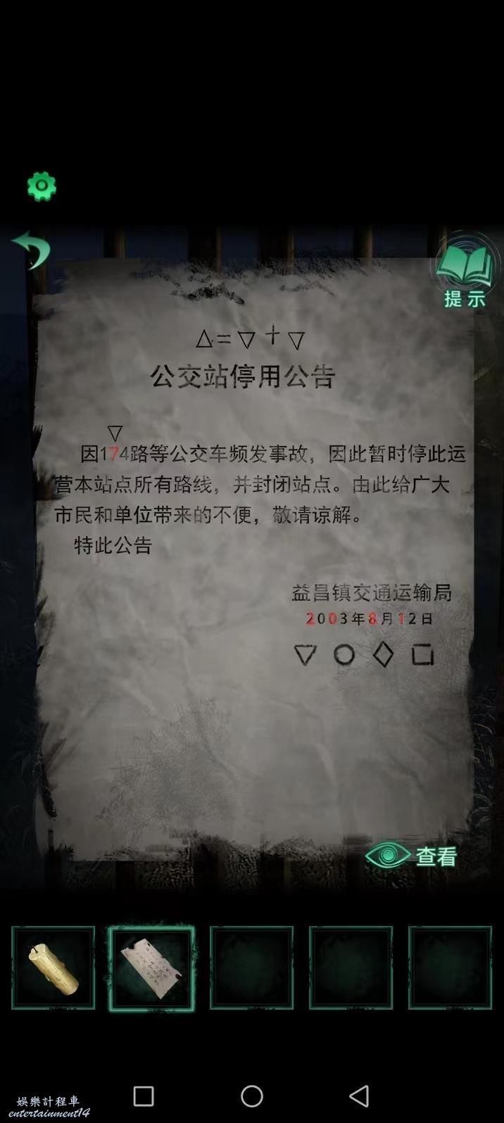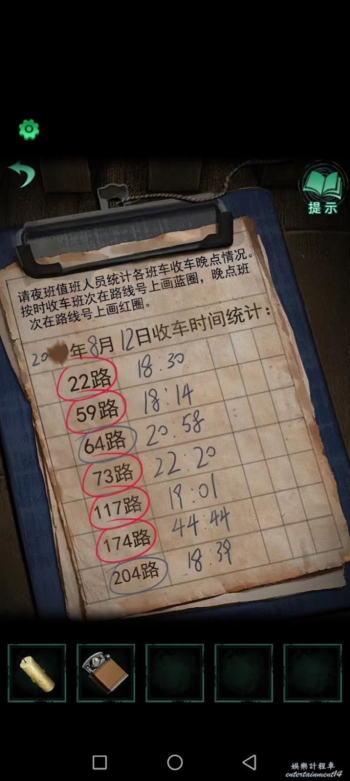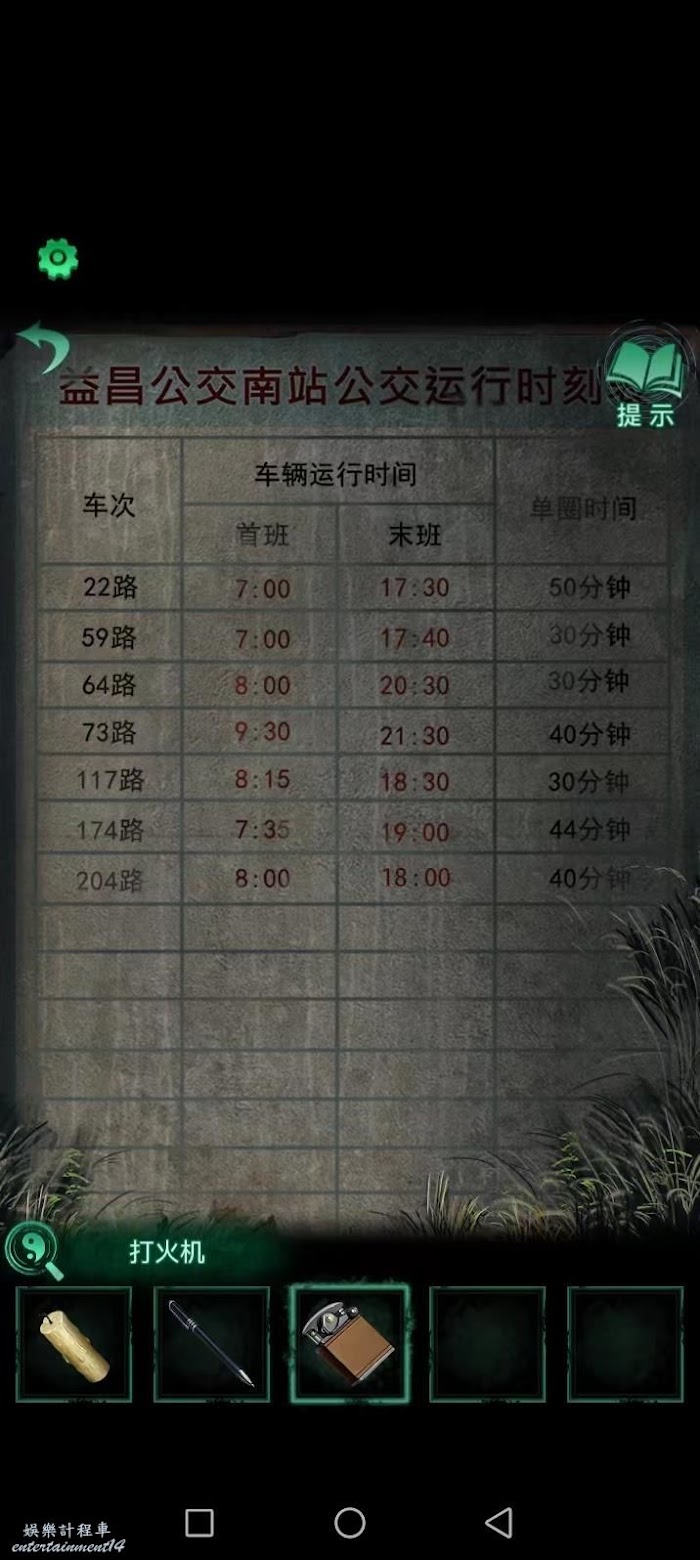 8、打開手提箱後,取出背景介紹和線索 上中上下下上,還有蠟燭,紅筆,打火機,然後去車頭按公交司機的按鈕,上中上下下上,車頭車燈亮起,就可以下車去小破屋那邊;