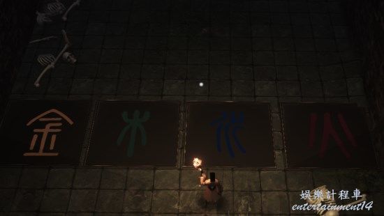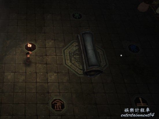 接下來來到右邊的解密密室,這裡的解密同樣很簡單,按出金木水火土的順序就可以。