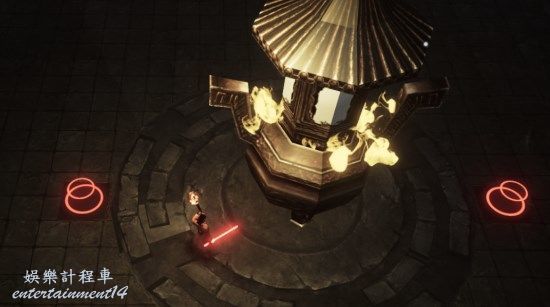 這裡需要玩家拖動對應爐火顏色的台柱到紅圈位置,拖完以後大門打開,門前的兩口棺材瞬間破棺而出,然後雙宿雙飛。