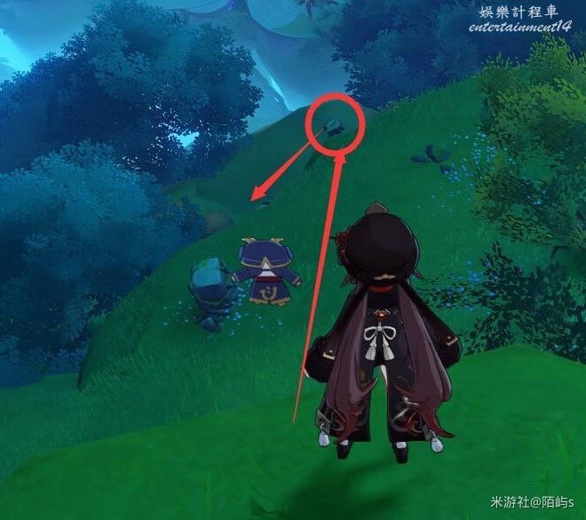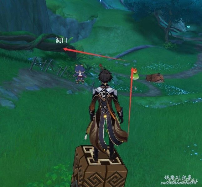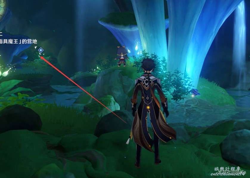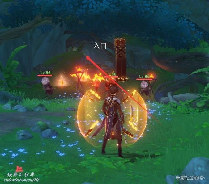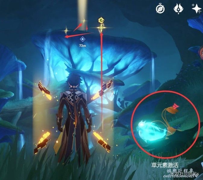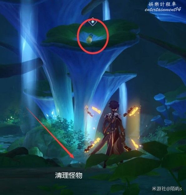 劇情結束朝著左前方的洞口進去,進去後一直往前走。你會遇到一個巨大的蘑菇,右手邊有一個眾葉覺蕊,草元素啟動它。
