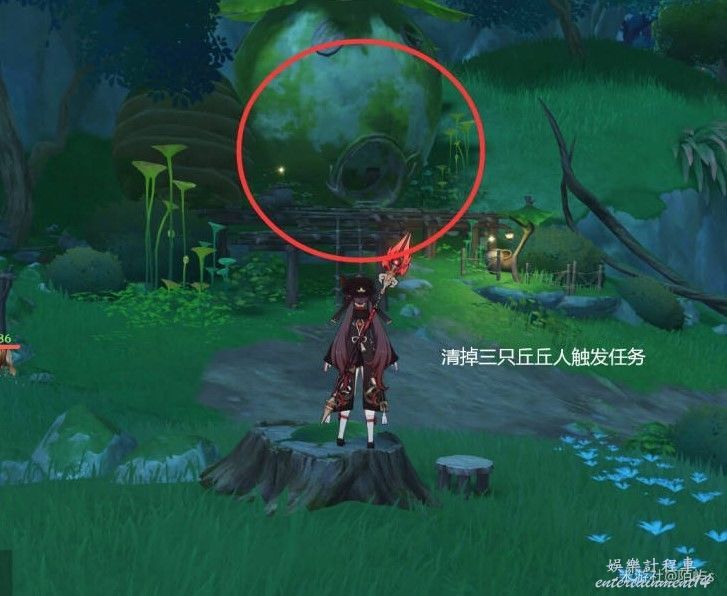 到達樹樁後,朝背後看就能看見這個小房子。房子外面有三隻丘丘人,清完觸發任務。
