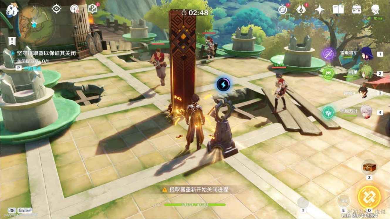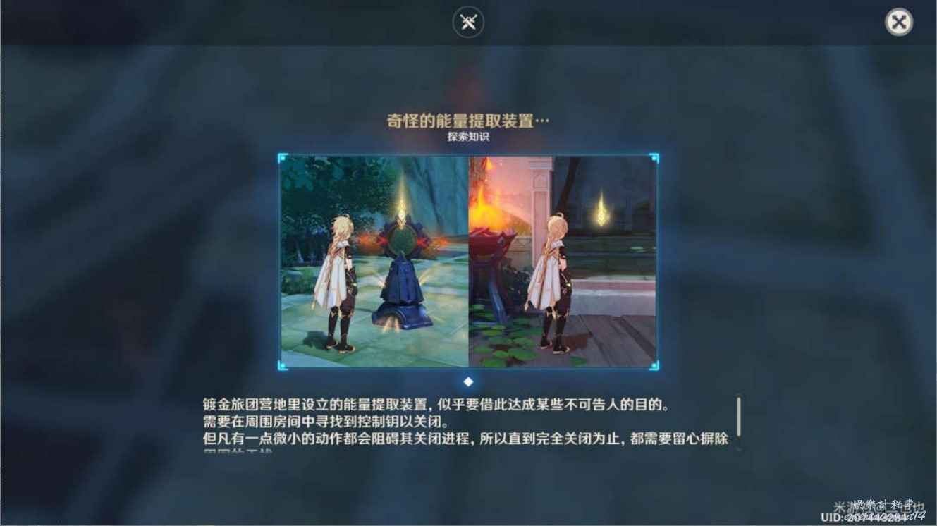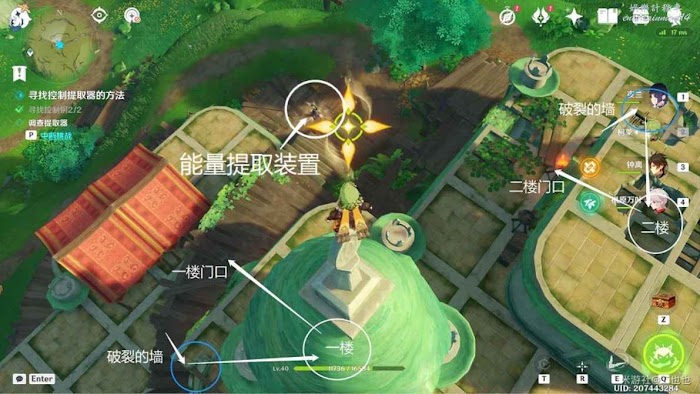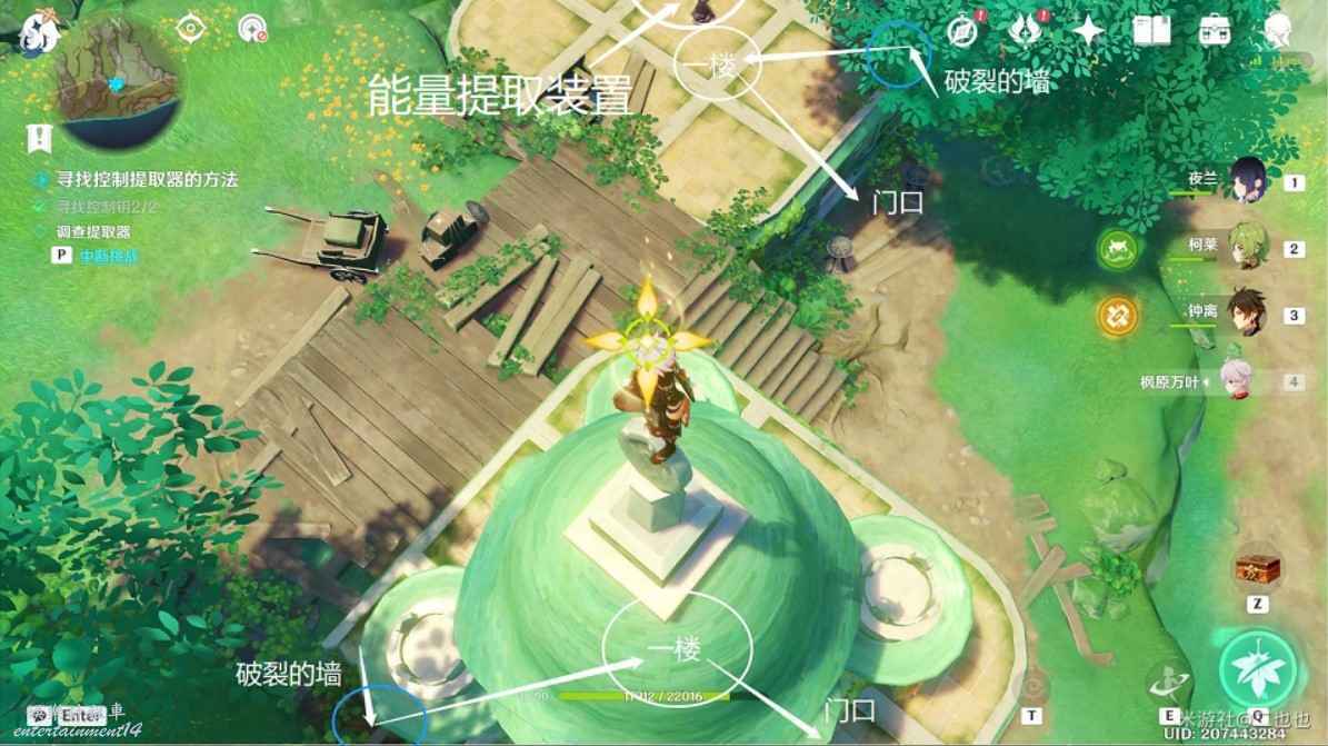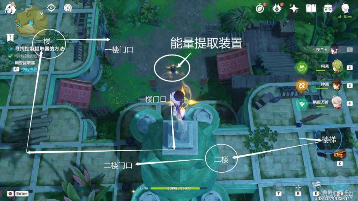 前往能量提取裝置,開啟挑戰,利用四葉印,飛到屋頂,按圖中指引路線,在周圍房間中尋找2個控制鑰,挑戰達成,獲得寶箱。