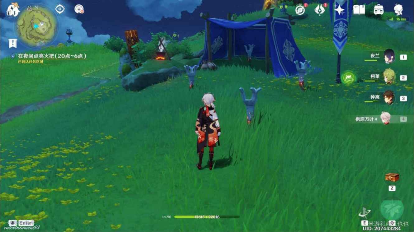 秘密聯絡處的營地:水天叢林山上的帳篷附近,有四個火把。在夜晚點亮火把···