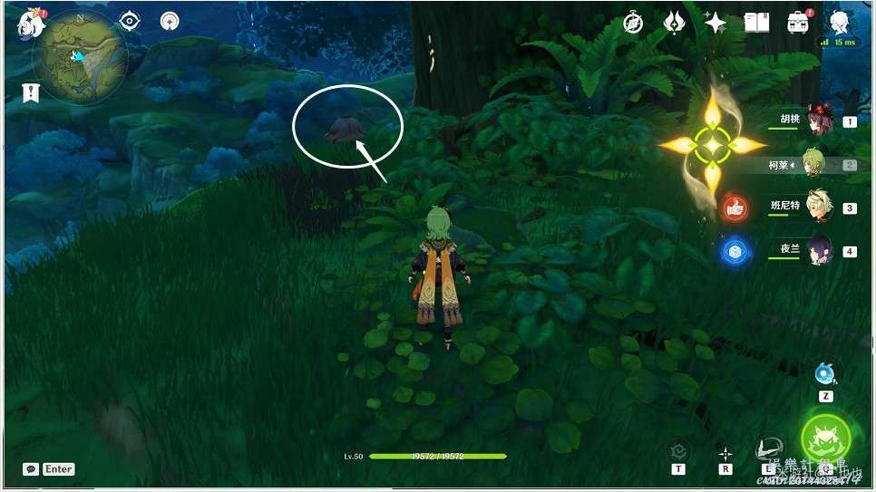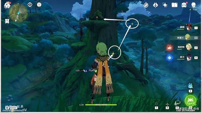 回寶箱位置,往地圖的東南方向走,柯萊蓄力射擊眾葉覺蕊,利用四葉印,飛往圖中指引位置
