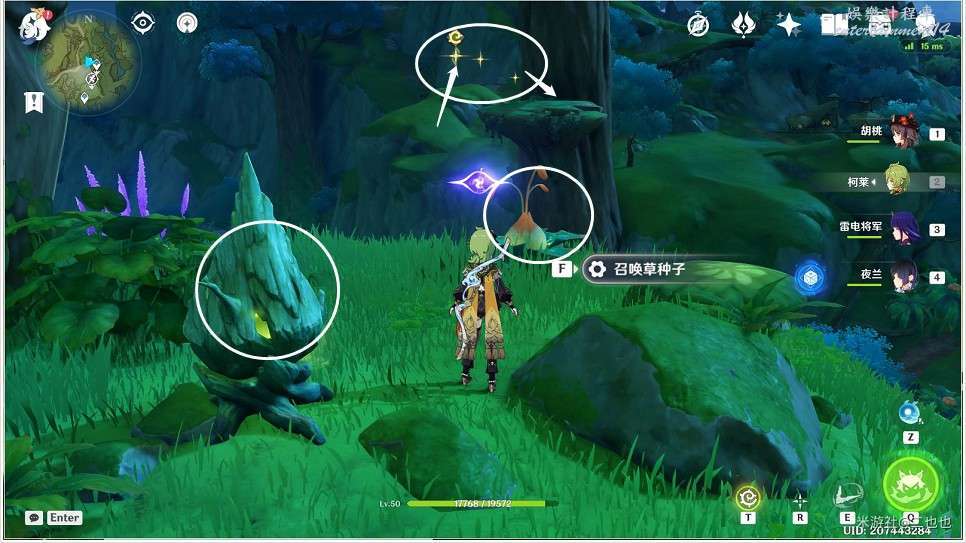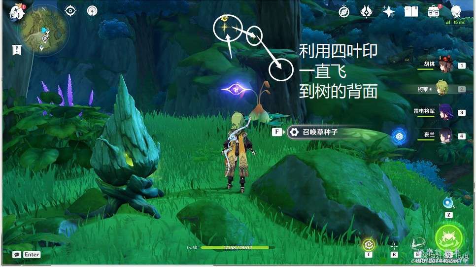 往地圖的西南方向看,柯萊蓄力射擊眾葉覺蕊,召喚草種子,利用四葉印,飛往圖中指引位置
