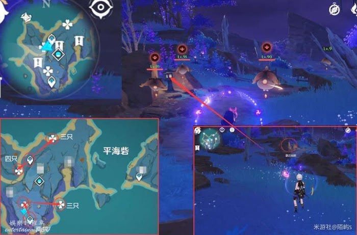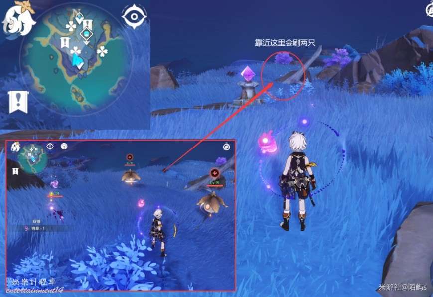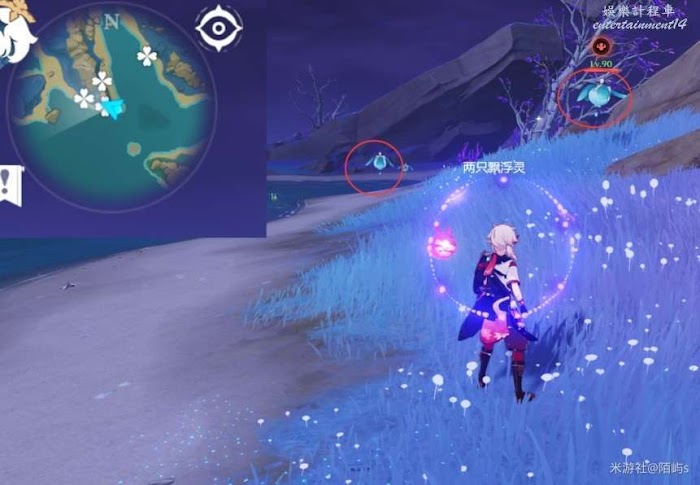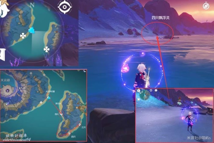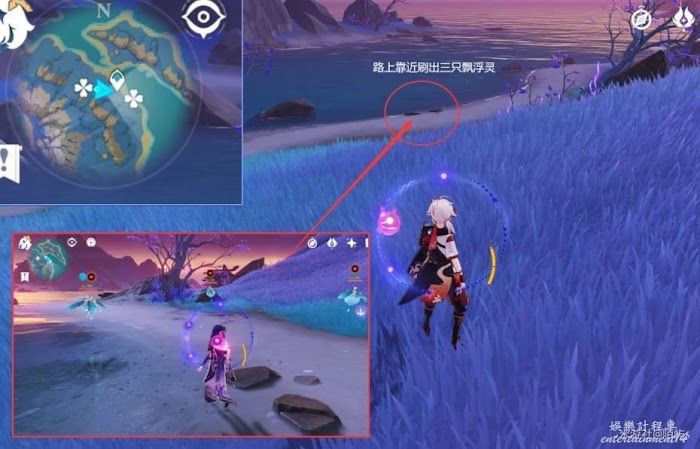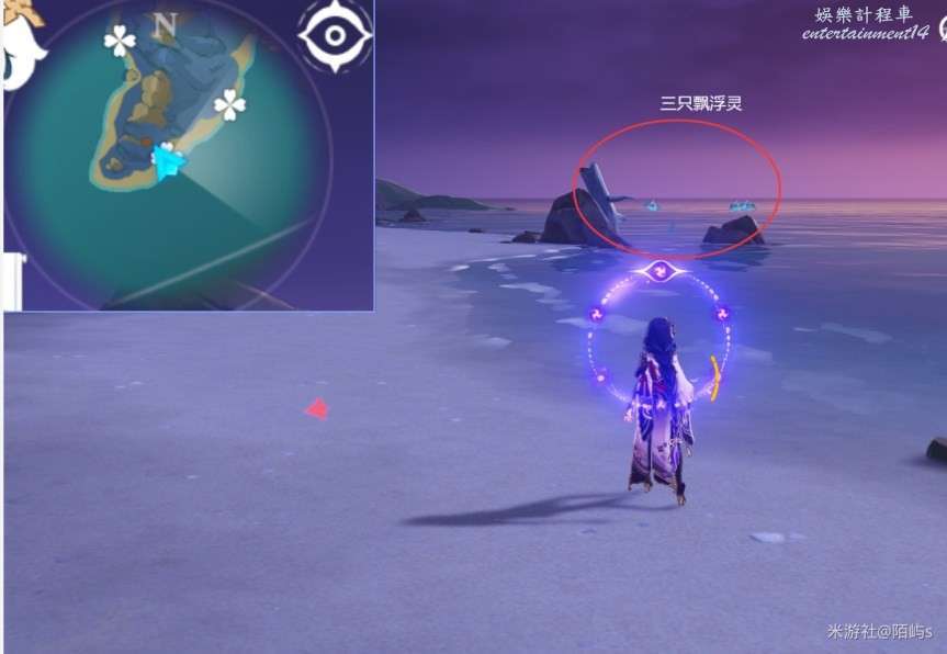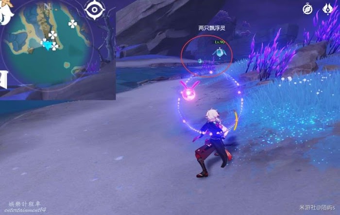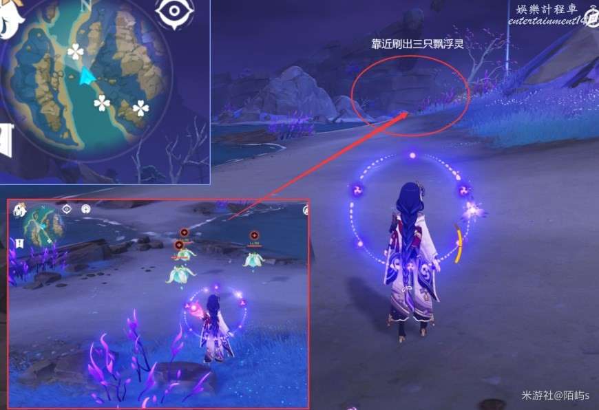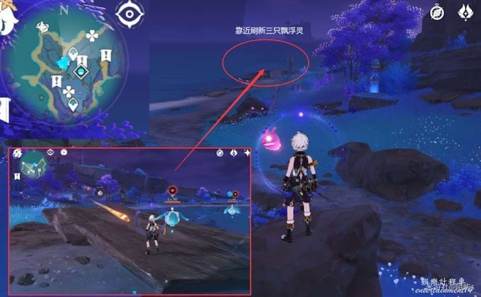 清完朝著地圖的西方向跑,跑到岸邊能看見一個雷種子,靠近之後刷出三隻飄浮靈。