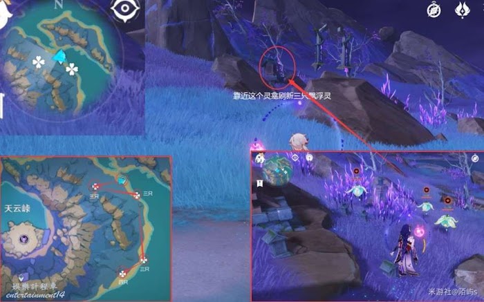 首先我們來到天雲峠的傳送點,朝著地圖的西方向看,有個靈龕靠近之後刷出三隻飄浮靈。