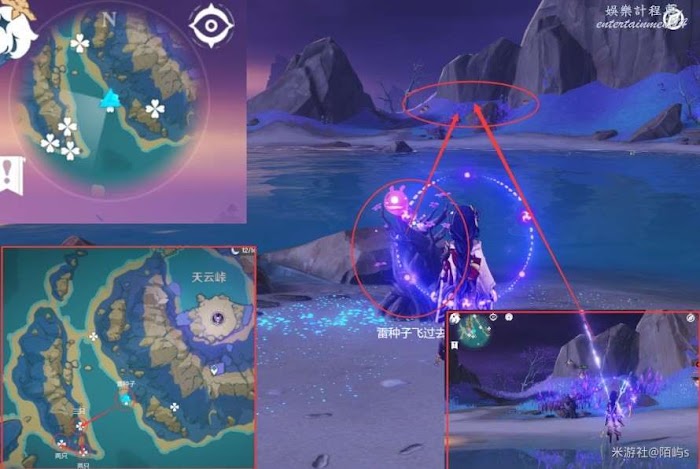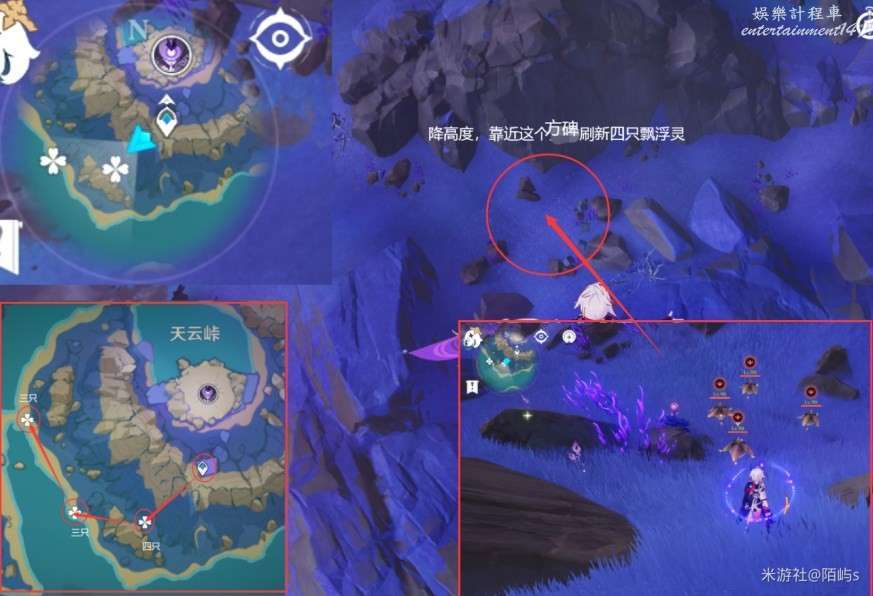 我們來到天雲峠下方的傳送點,朝著地圖的西南方向飛,把高度降低點就能在腳下看見四個雷解密石,靠近刷出四隻飄浮靈。
