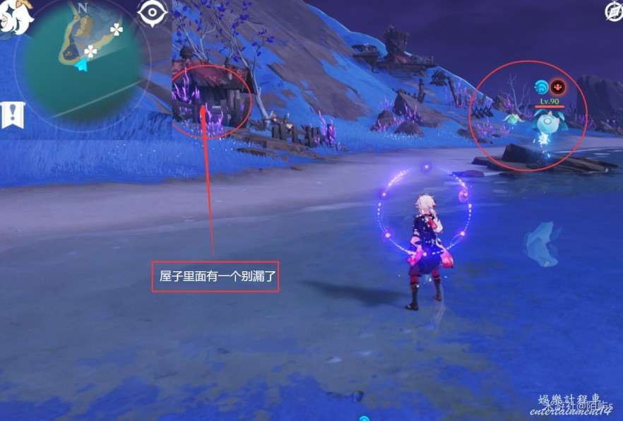 清完我們直接繞著岸邊走,一直走到拐角往前就能看見三隻飄浮靈,左邊房子裡面還有一隻別漏了。