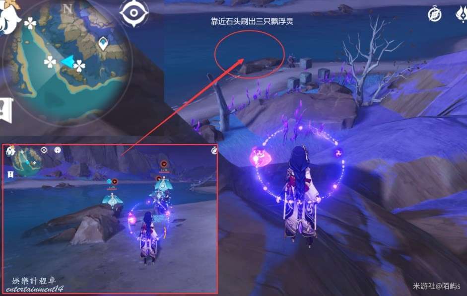 清完朝著地圖的東方向跑,路上有兩個小石塊,靠近之後刷出三隻飄浮靈。