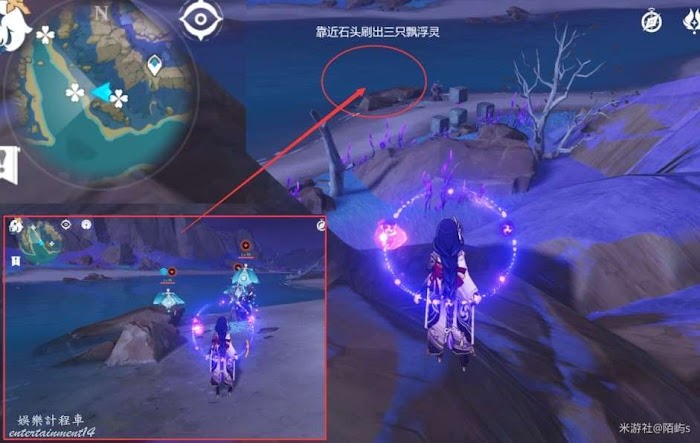 清完朝著地圖的南方向看,前面有個大石塊,靠近之後刷出三隻飄浮靈。