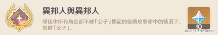 一場戰鬥中沒有被「公子」標記的後續攻擊命中並擊敗「公子」,即可獲得成就「異邦人與異邦人」。