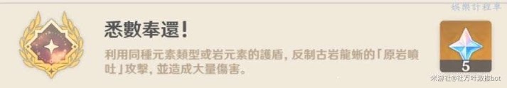 完成這個成就推薦使用鐘離和諾艾爾的元素戰技,等待古岩龍蜥即將釋放「原岩噴吐」時開護盾,反制並造成大量傷害後即可獲得成就「悉數奉還!」。