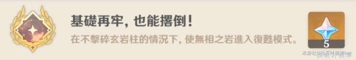 完成這個成就推薦使用甘雨、宵宮等弓箭角色或法器角色。將無相之岩血量打剩一點血後,它便會進入復甦模式。此時即可獲得成就「基礎再牢,也能撂倒!」。
