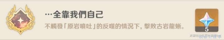 完成這個成就時最好不要使用岩元素角色和制盾角色。不要拾取元素晶片。擊敗古岩龍蜥後即可獲得成就「…全靠我們自己」。