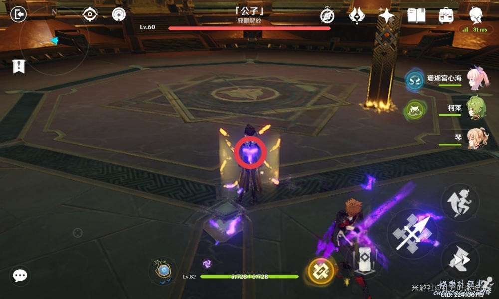 紫色標記的後續攻擊也有兩種:一個是「公子」在地上進行圓形標記,並插下數把雷刃;一個是標記角色,角色周圍將出現紫色雷環,「公子」蓄力雷元素,從天而降造成大量傷害。