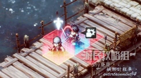 追擊:進行物理攻擊時,如果敵人的另一側有能夠進行攻擊的我方單位與攻擊者形成夾擊之勢,則另一側的我方單位會自動發動追加攻擊(追擊)。滿足追擊的條件時,在選擇目標的時候會顯示圖中的標記。