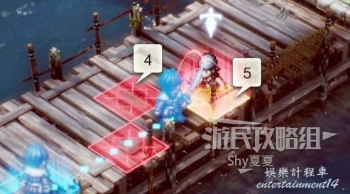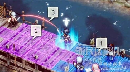 區域和線說明:藍色區域敵人射程外的可移動範圍,紫色區域敵人射程的可移動範圍,紅線為有可能發動攻擊的敵人,紅色區域為可攻擊的範圍,黃色區域為指令效果的覆蓋範圍。