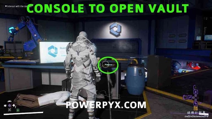擊敗房間內的敵人後,樓上有個控制台開關就在金庫門的正前方。按【十字鍵-下】掃描並高亮,與之互動解開開啟金庫。
