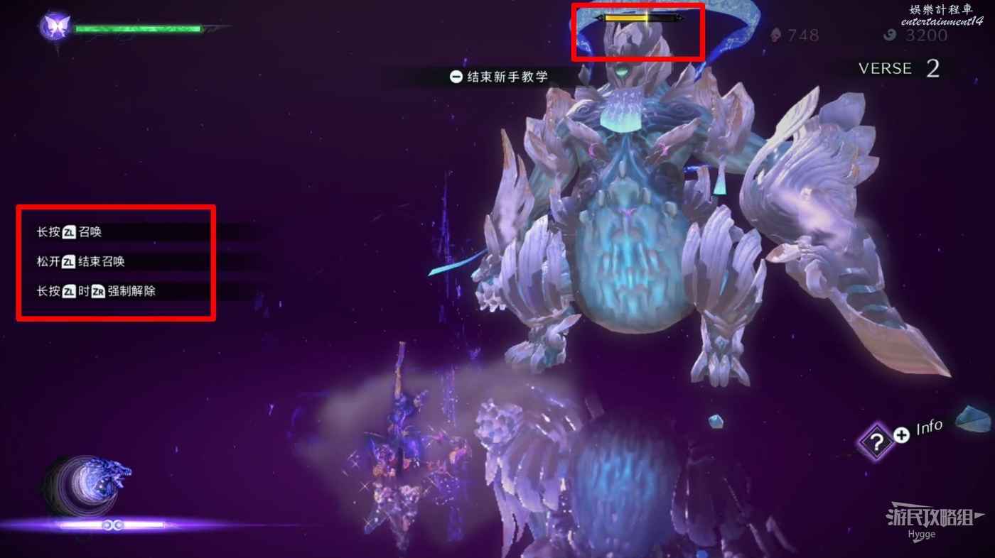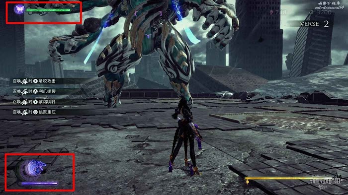 在介面左下角可以查看當前能夠召喚的惡魔,同時最多攜帶三個,按十字鍵左右上切換。召喚惡魔時會持續消耗下方紫色的魔力值,當魔力值消耗完畢後也會自動結束召喚,魔力值會隨著時間緩慢恢復,或通過攻擊敵人進行恢復。