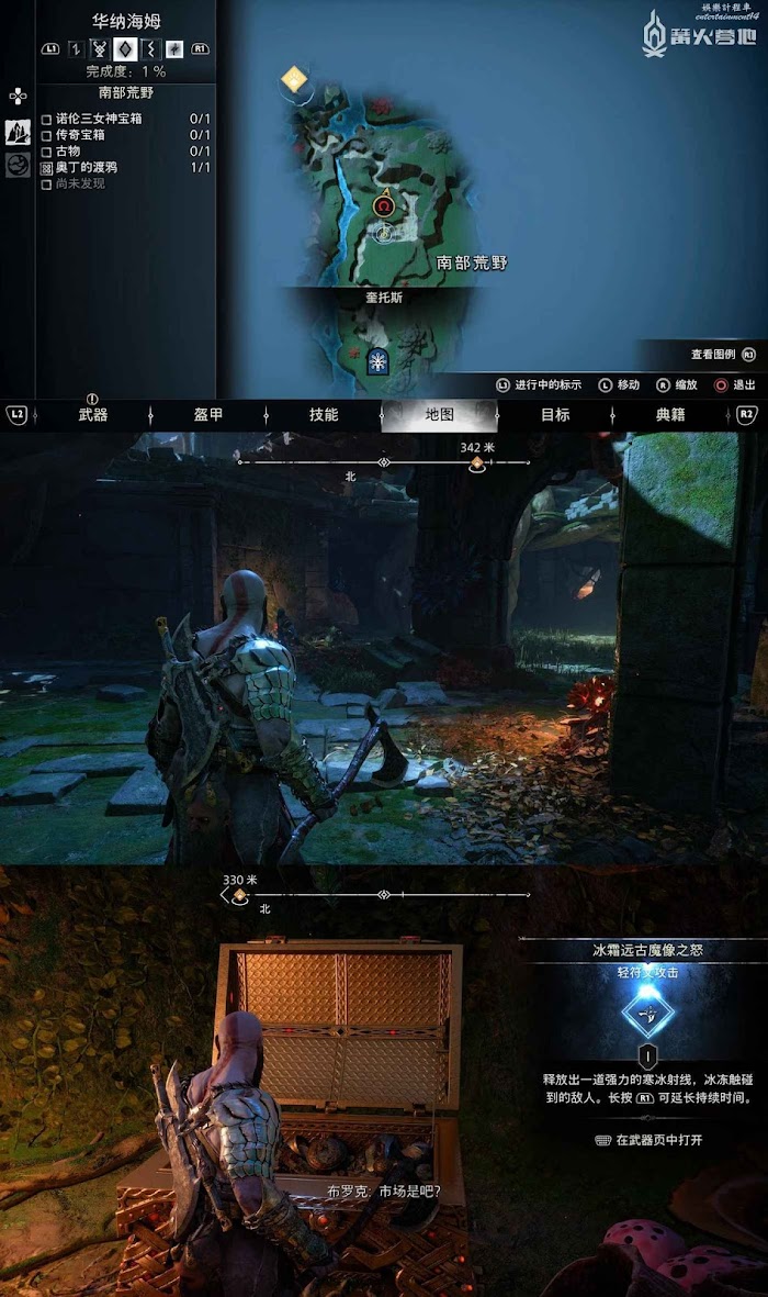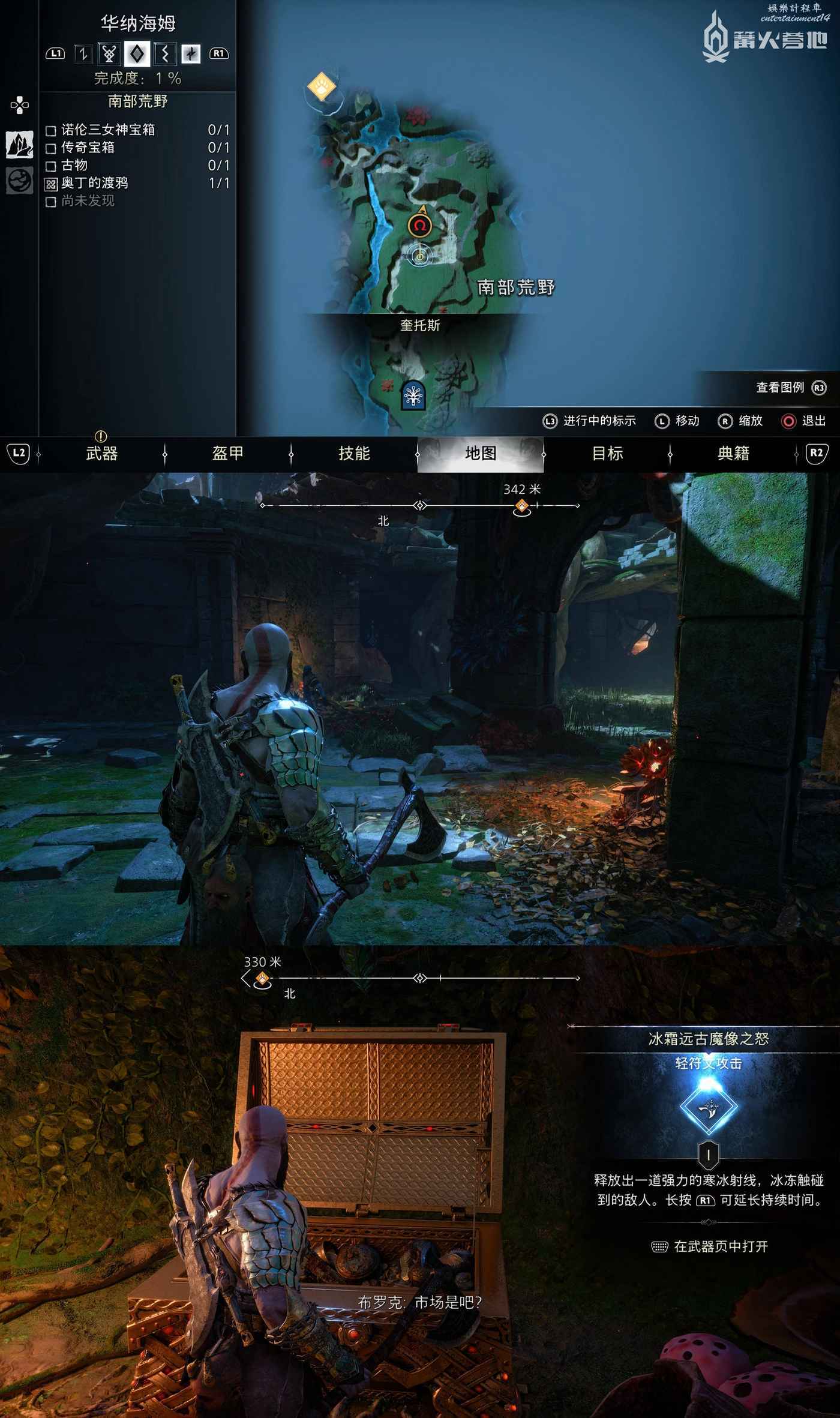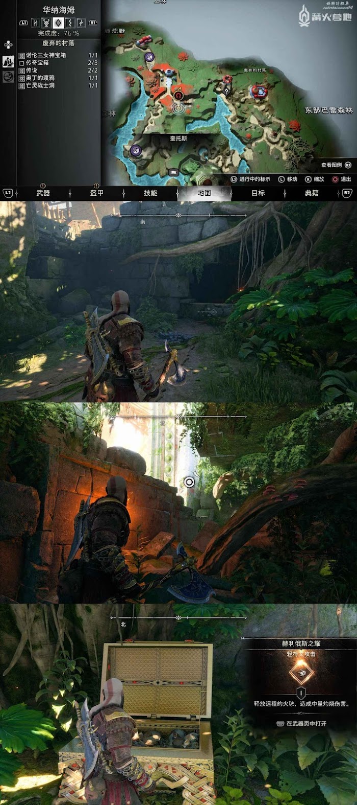 在「華納海姆 – 華納神族神殿」,下圖位置可以找到「傳奇寶箱」,不過首先要先上一層,點燃植物後用斧頭擊碎連接裝置開啟大門,可以獲得「輕符文攻擊 – 狂暴衝撞」。
