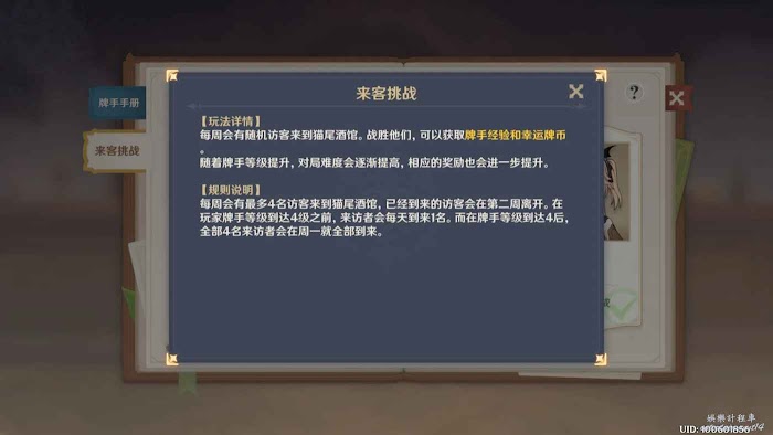 注意:每週會有最多4名訪客來到貓尾酒館,已經到來的訪客會在第二周離開。在玩家牌手等級到達4級之前,來訪者會每天到來1名。而在牌手等級到達4後,全部4名來訪者會在週一就全部到來。