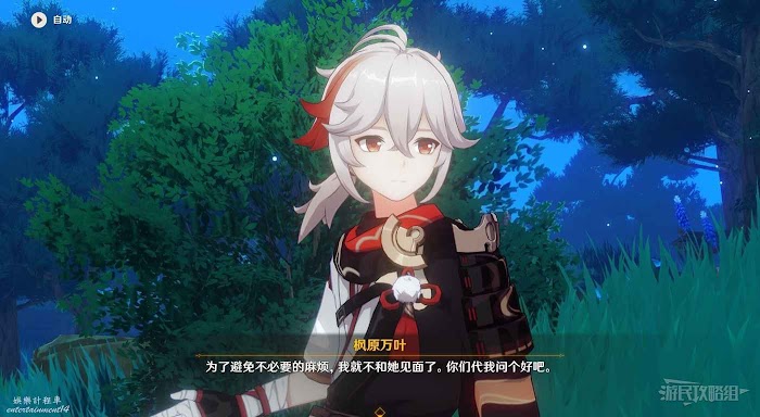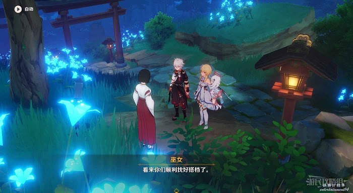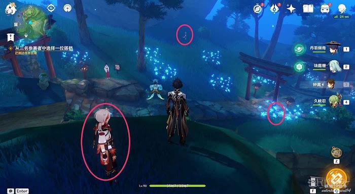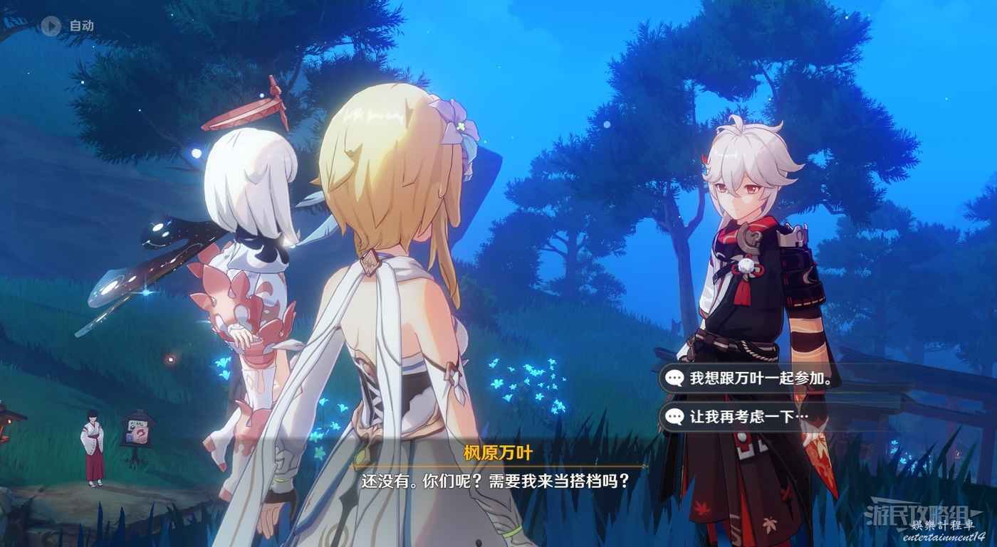 巫女告訴我們需要尋找搭檔,我們需要從楓原萬葉、五郎和神裡綾華中選擇一位角色成為搭檔。三位的位置都在巫女附近,神裡綾華在鳥居旁邊,五郎在巫女身後的草地上,萬葉在巫女對面的岩石上。