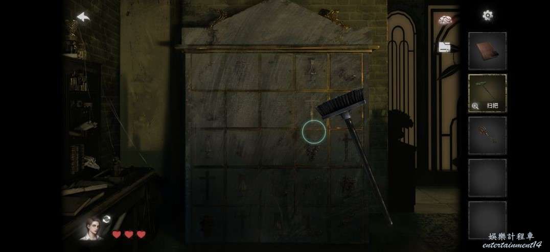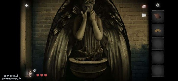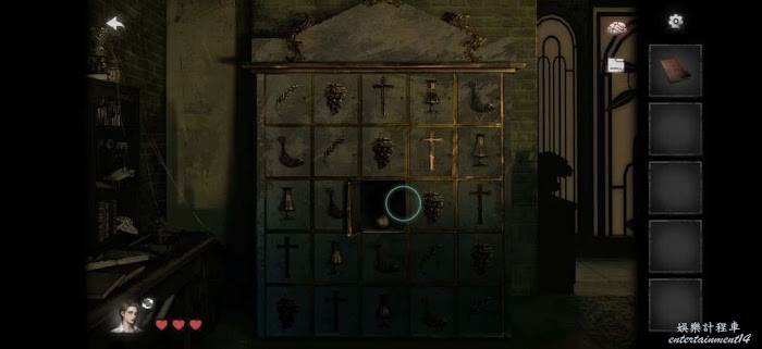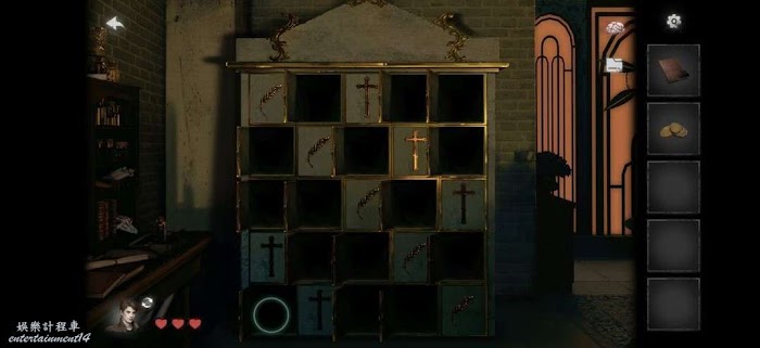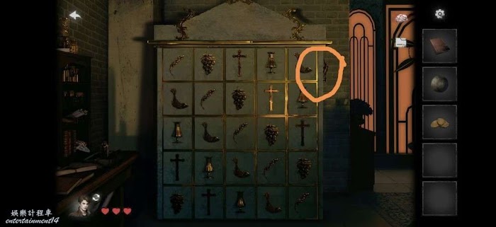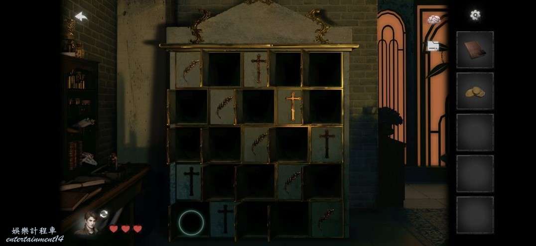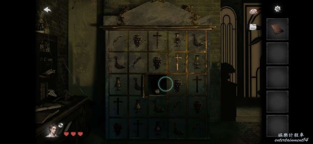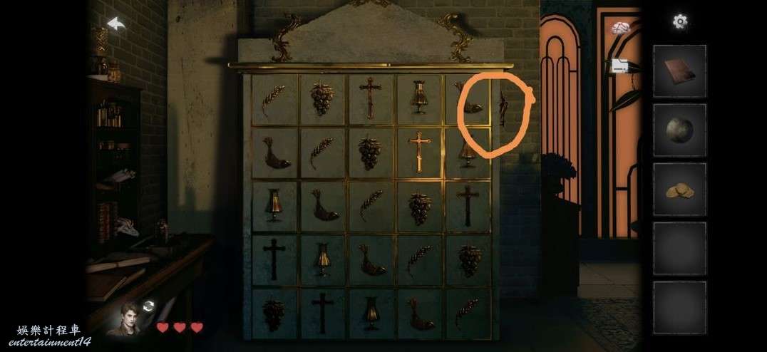 切換男主視角,根據紙條內容打開聖櫃,空白格的櫃子都打開,露出天使像