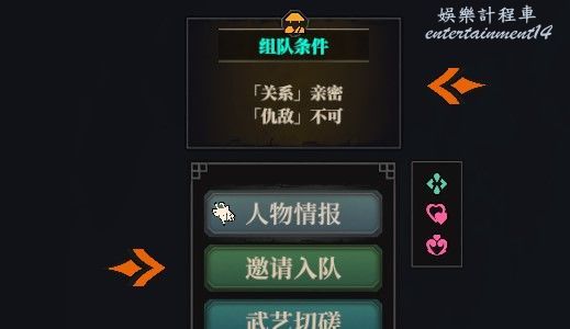 當我們點開一位角色的互動介面後,我們可以通過圖示來判斷該npc是否可以組隊,以及可以達成的關係,滑鼠挪到圖示上可以看到具體說明。