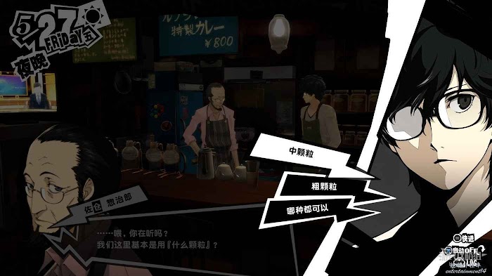 夜晚回到咖啡館後向惣治郎請教泡咖啡的方法,當老闆提問時選擇回答【中顆粒】即可提升好感度,將惣治郎的COOP教皇提升至3級。