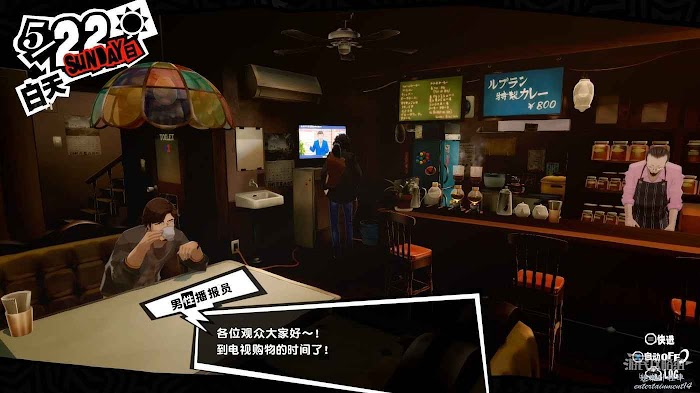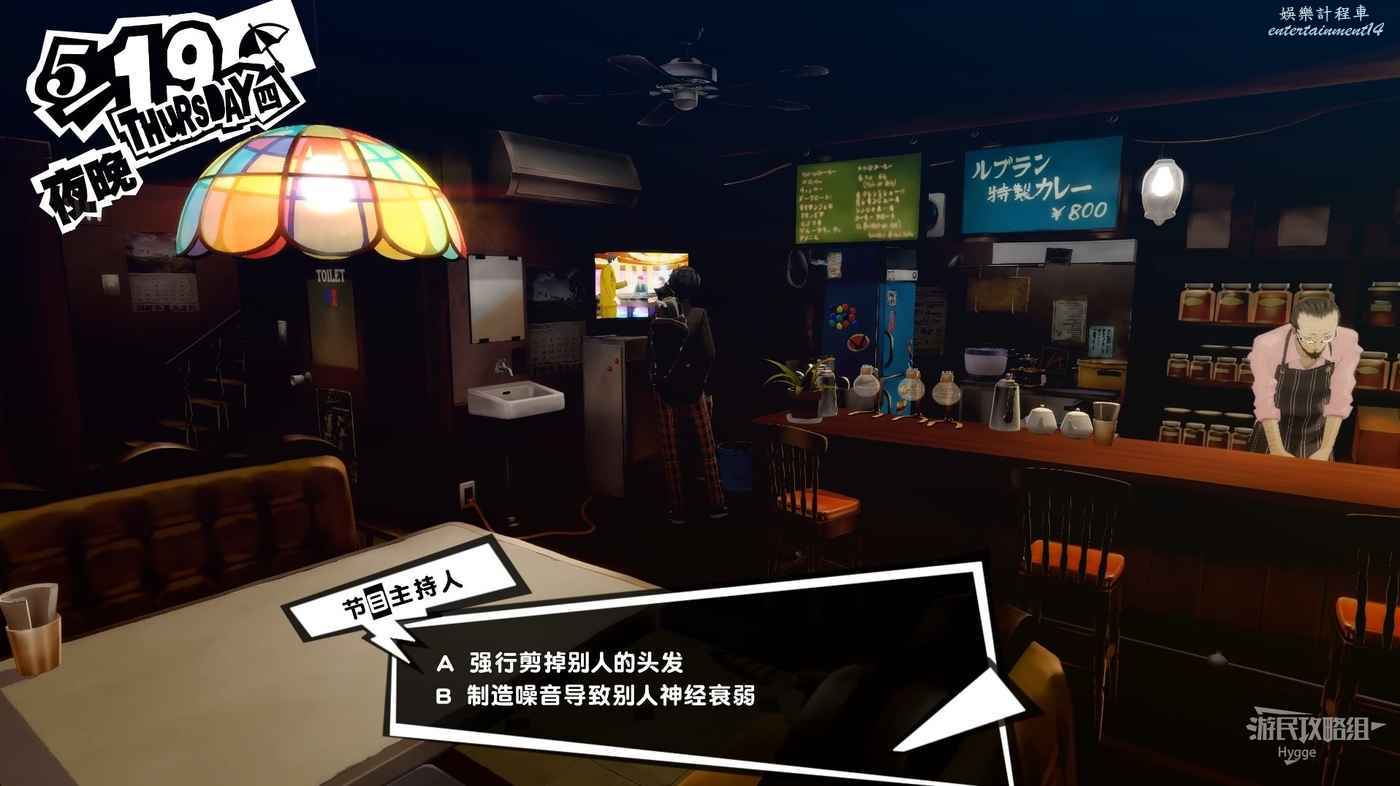 夜晚回到咖啡館後可以回答電視問答節目上的問題,正確答案為【製造噪音導致別人神經衰弱】,回答正確後可以獲得知識點數。