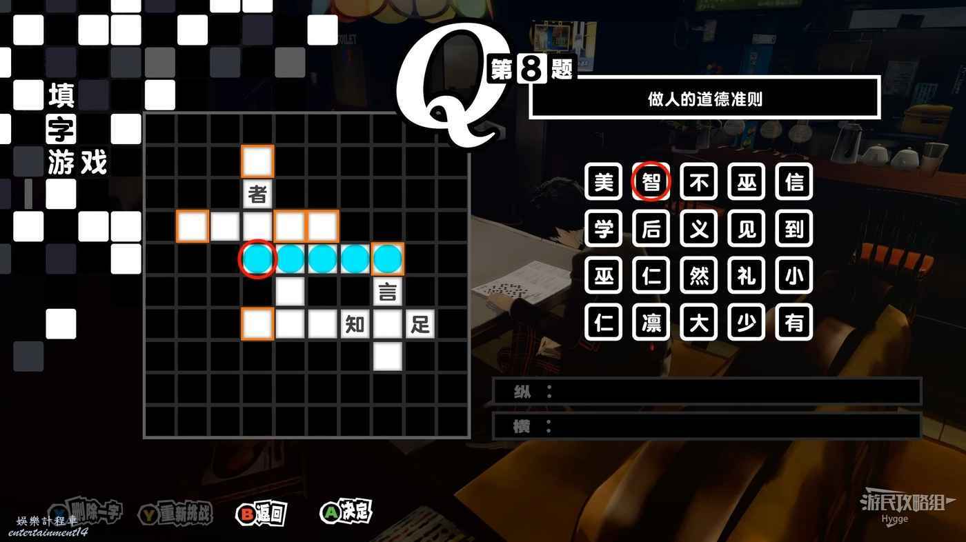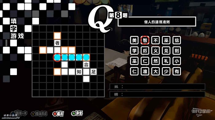 今晚回到咖啡館後可以進行填字遊戲,正確答案為【仁義禮智信】,完成遊戲後可以獲得知識點數。