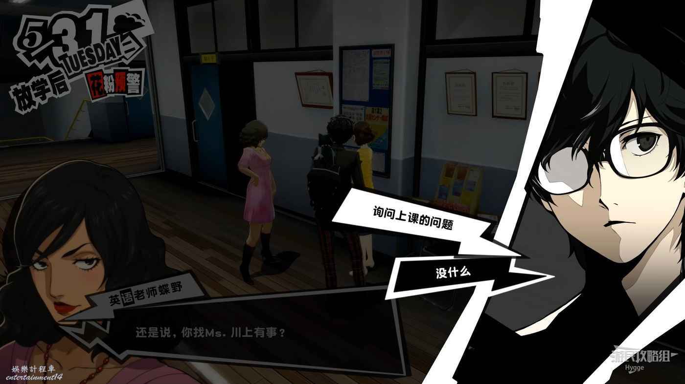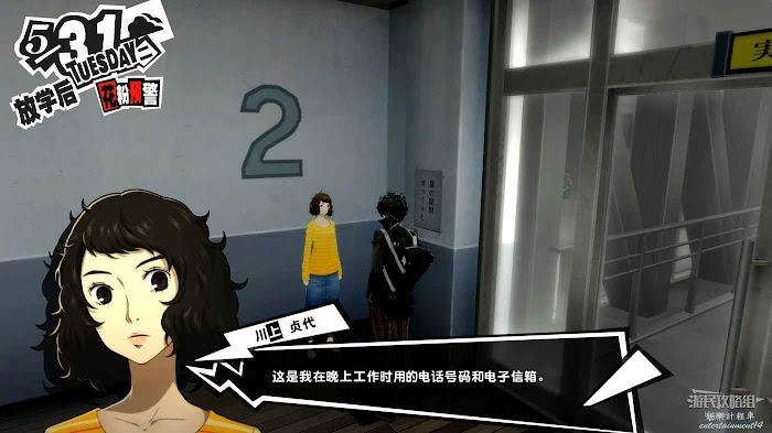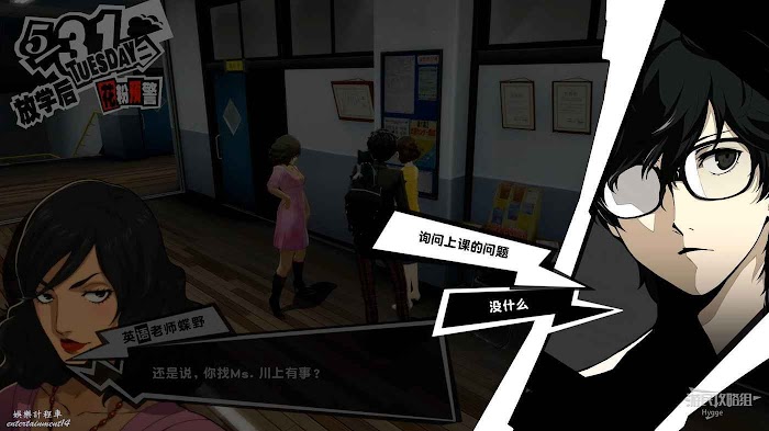 放學後在學校走廊中可以找到被蝶野老師纏住的川上老師,上前與川上老師對話選擇【詢問上課的問題】幫助川上解圍。