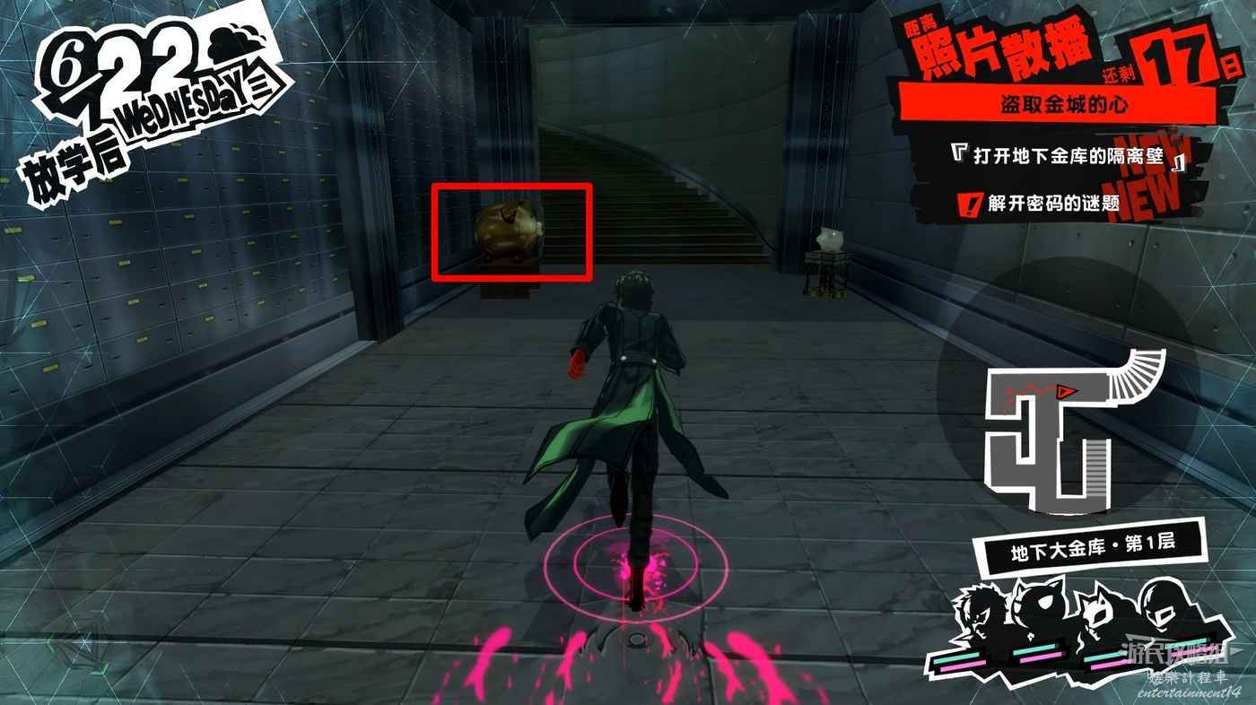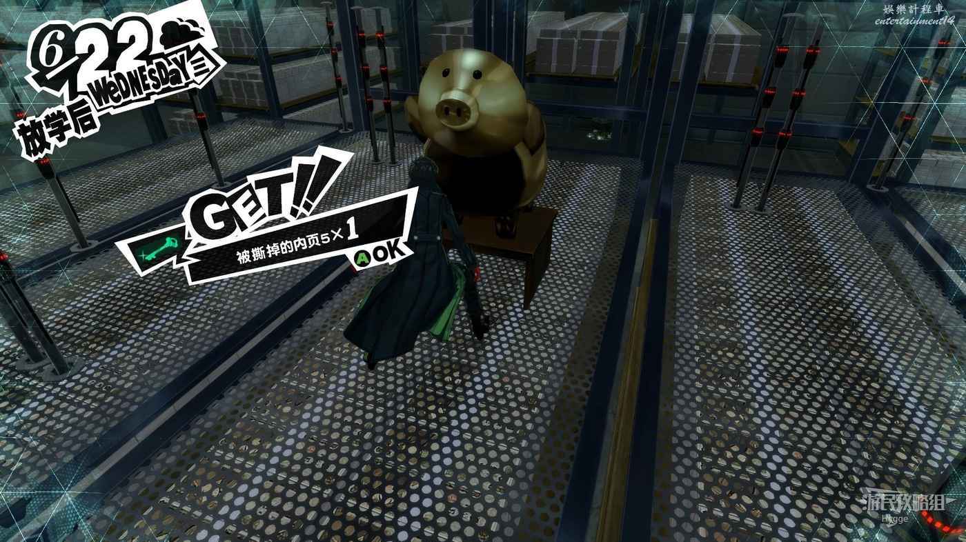 在房間中消滅警衛後操作控制終端可以打開前進的道路,隨後在房間中能夠獲得一個寶箱和並發現一個奇怪的金豬,調查金豬後獲得【被撕掉的內頁1】,得到密碼提示P=I。