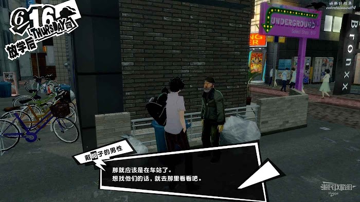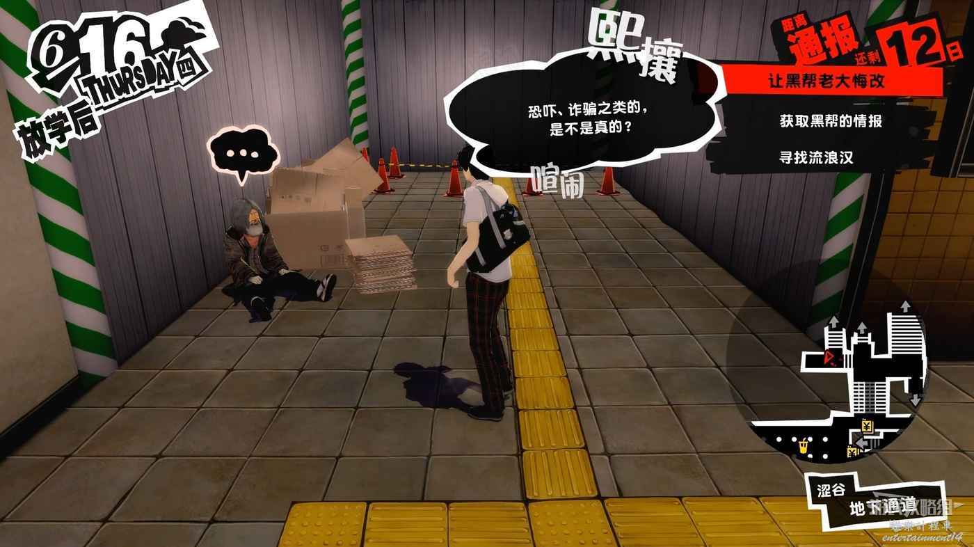 在澀谷地下通道西北出口可以找到一個流浪漢,與流浪漢交談得知現在這個時間在街上閒逛就能遇到黑幫。